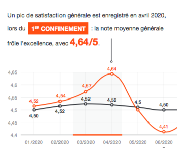 En 2020, la moyenne générale de l’ensemble des notes moyennes sectorielles met en valeur un pic inédit. Lors du premier confinement, la moyenne des notes moyennes des 22 secteurs analysés frôle l’excellence, avec un pic de 4,64/5.