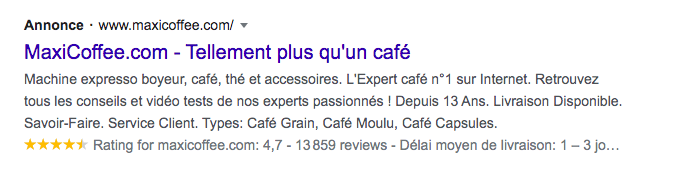 Par ailleurs, les avis clients sont des Rich Snippet compatibles avec le SEO et le SEA sur Google. Comme MaxiCoffee, vous pouvez utiliser les avis clients pour dynamiser vos campagnes de référencement payant :