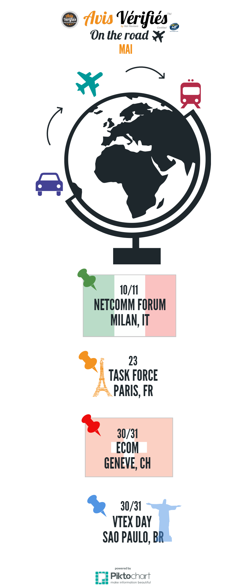 Après un mois d’Avril bien chargé en événement avec la Task Force, le e-marketing Paris, l’IT JOB DAY & les Big Boss du tourisme, Avis Vérifiés continue son tour du monde! Au programme: le netCom Forum à Milan, la Task Force à Paris, l’eCom Genève et le VtexDay à Saõ Paulo! On espère vous rencontrer sur un de ces événements!