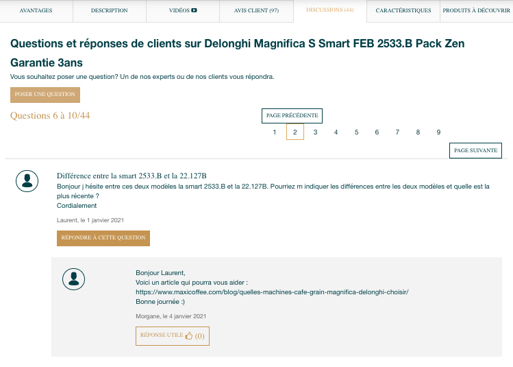 Certaines marques comme MaxiCoffee tirent même profit de l’outil pour enrichir leur stratégie de contenus. Si certaines questions récurrentes autour d’un même sujet sont identifiées, l’entreprise crée un article de blog pour apporter des réponses complètes et construites. Le lien de l’article est ensuite partagé dans le fil des réponses Q&A, pour aiguiller les internautes !