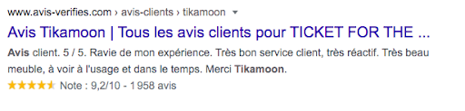 Pour remonter dans les SERP (pages de résultats) pendant les soldes, nous vous recommandons d’utiliser les avis en ligne comme Rich Snippet. Considérés comme des “contenus enrichis”, les Rich Snippet (ou Rich Content) sont des informations complémentaires qui apparaissent lors d’une recherche. Les prix, maps, FAQ, recettes de cuisine… Ou encore les notes étoilées améliorent la lisibilité d’une page, et par extension son SEO !